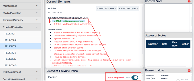 Each assessment objective includes a status field that allows auditor to mark it as Met or Not Met