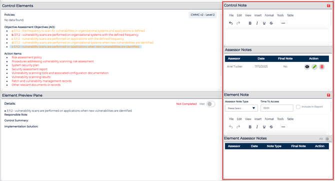Auditors can add notes at both the control level and the element level.