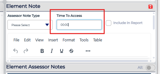 Each assessment objective includes a Time to Assess field. Time entered at the assessment objective level is automatically rolled up and totaled at the control level.