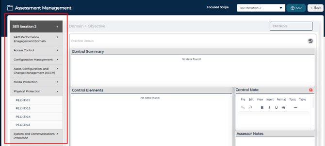 The left-hand sidebar displays all domains included in the assessment. Expanding a domain reveals its associated controls, listed by reference number. Selecting a control loads its detailed information in the main panel.