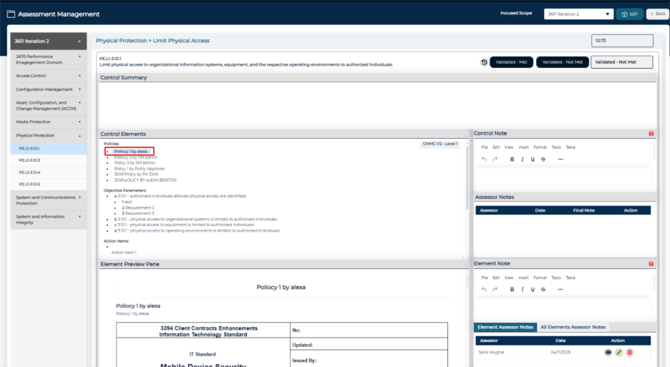 Selecting an element opens a preview panel showing its detailed information. This allows auditors to review supporting material without navigating away from the assessment context.