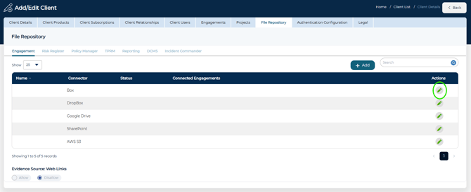 - Then, within the specific module tab you wish to configure, click the green pencil icon to Edit the Box repository connector.