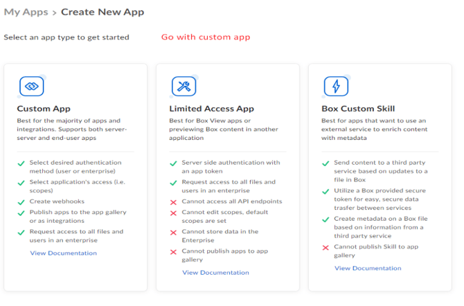 - Once you've clicked the Create New App button, it will offer three options of app types to create. Select the Custom App option.
