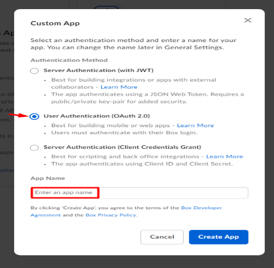 - Next, you'll be prompted to select the Authentication Method. Select User Authentication (OAuth 2.0), and then provide an App Name for your app. This name can be anything that identifies it's purpose. Once complete, click Create App.
