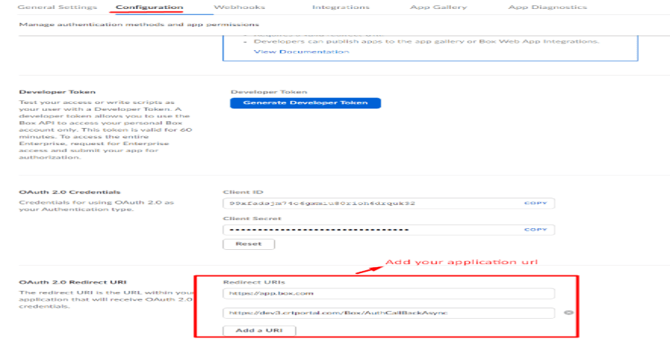 - You will now be shown a number of configuration options for your newly created app. On the Configuration tab, there is an option for OAuth 2.0 Redirect URI. Click the Add a URI button, and in the field you will enter the base URL of your PBC application and append /Box/AuthCallBackAsync as shown in the example: https://example.crtportal.com/Box/AuthCallBackAsync.