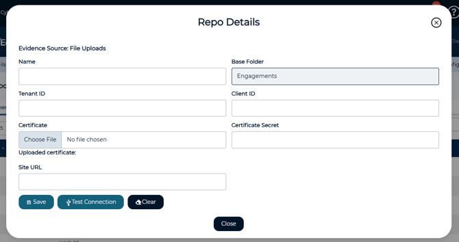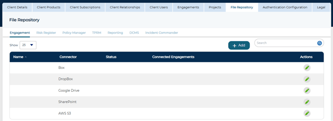 This view displays the available repository options for the client. Multiple repositories can be configured for engagements, while single repositories are used for other modules