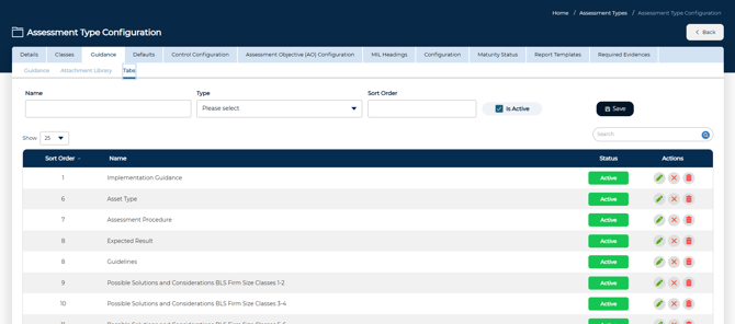 (This screen illustrates where the individual Guidance tabs are configured within the Assessment Type Configuration area.)