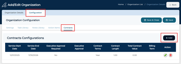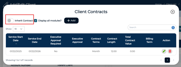 All contracts created at the organization level will automatically apply to newly created associated clients.